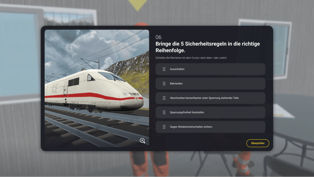 Wir erschaffen realistische Umgebungen mit echten Gefahrenquellen. Ob Strom, Zugdurchfahrt oder Arbeitsgeräte. Wir schicken Ihre Mitarbeitenden auf eine digitale Baustelle und bereiten Sie so auf alltägliche Tätigkeiten und damit verbundene Gefahren vor.